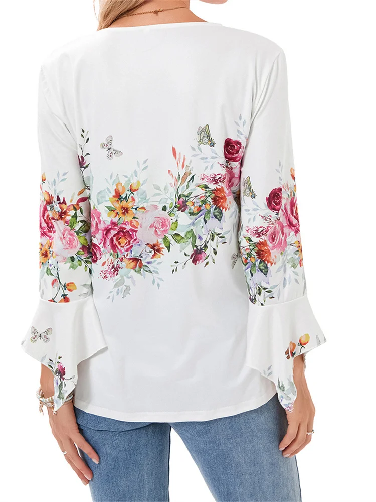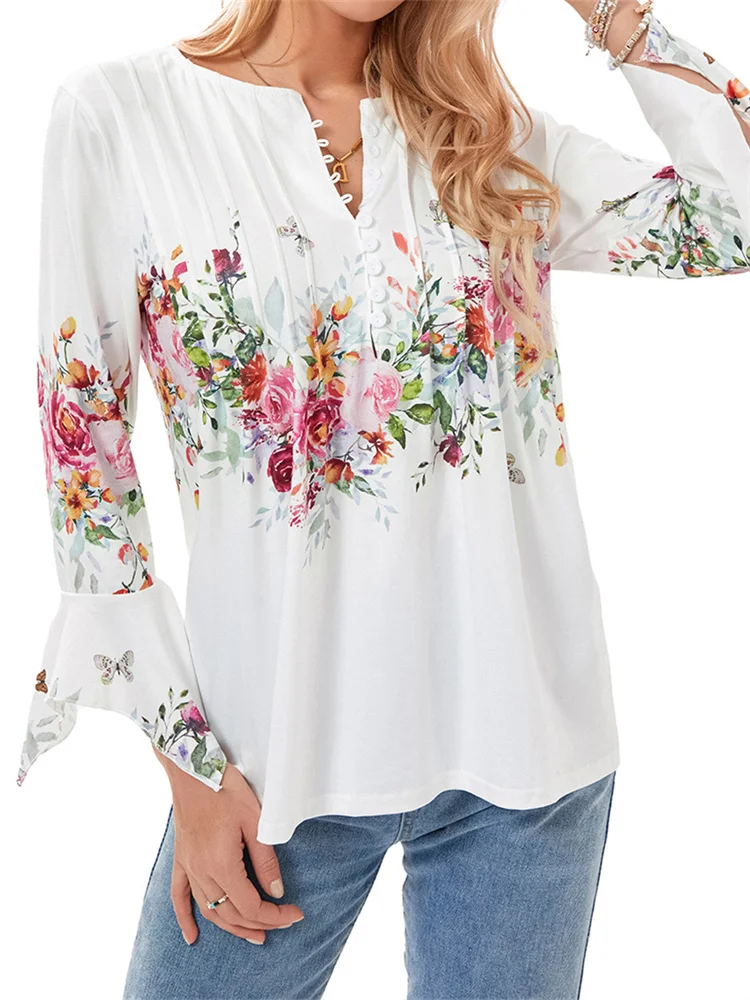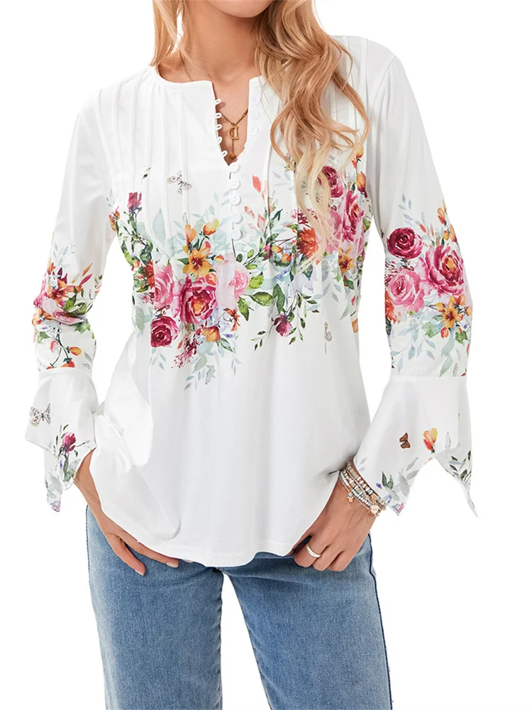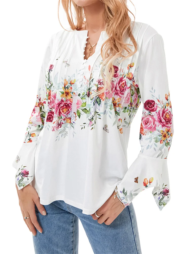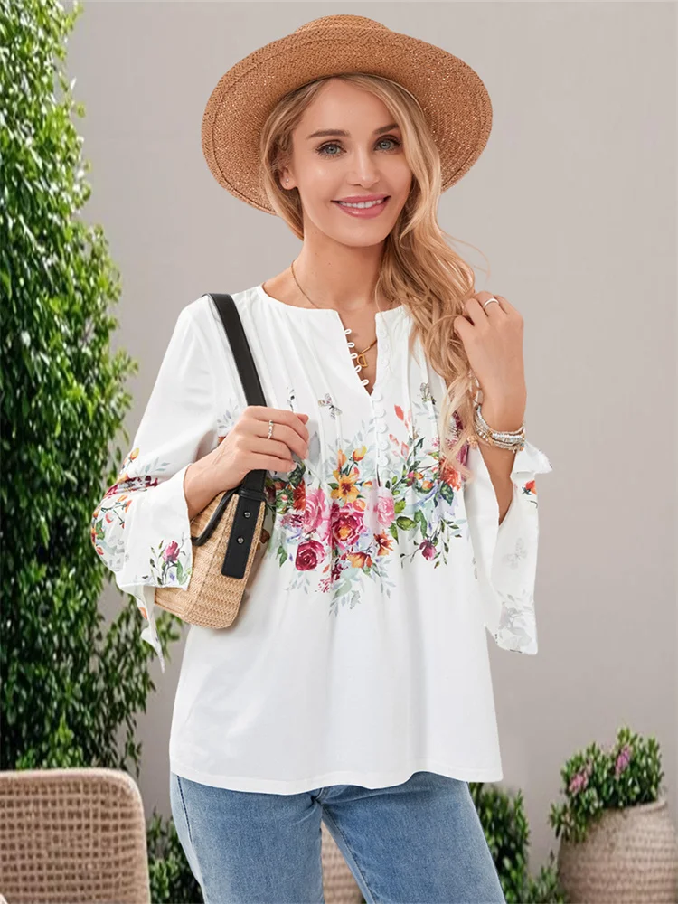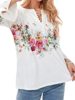 Women’s Spring Floral Print Tops 3/4 Sleeve Front Button V-Neck Casual Elegant Loose Blouse