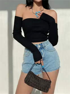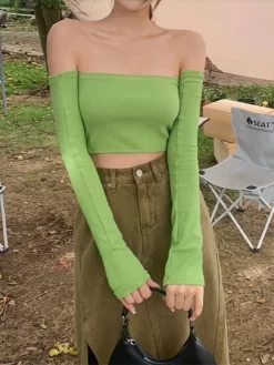 Female Crop Tops, Solid Color Boat Neck Blouse with Long Sleeves