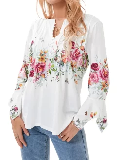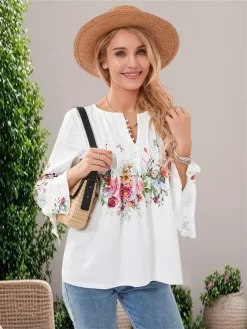 Women’s Floral Print Tops 3/4 Sleeve Front Button V-Neck Casual Elegant Loose Blouse Summer Fall Shirts